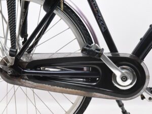 Een dichte kettingkast met 7 versnellingen en rollerbrakeremmen.
