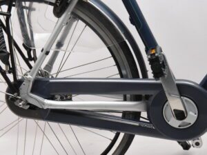 Fiets heeft een dichte kettingkast met 8 versnellinen en hydraulische remmen.